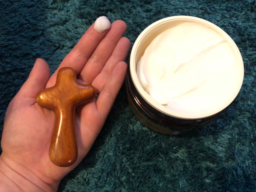 When it comes to things for me, I rarely treat myself just for the sake of it. I don’t often wear make up or scents. I buy clothes but mainly in the search for items that will make me feel less frumpy. The beauty industry is a multi-million dollar money pit I rarely throw my pennies into. But recently, a friend invited me to support her in a beauty business venture, and (long story short) I ended up with a rather large pot of very delicate, very smooth, lightly scented body cream, witha body I never put cream on to use it with…